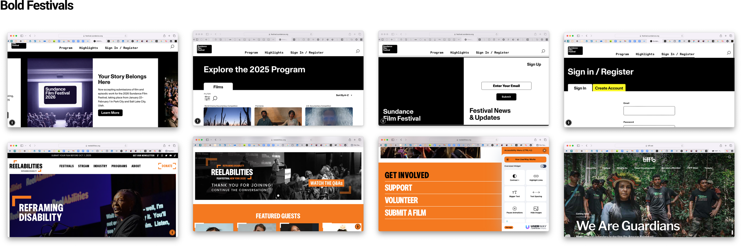 To inform the new direction, I conducted a competitive analysis and heuristic evaluation of leading film festivals and cultural organizations such as Sundance Film Festival, Cannes Film Festival, Toronto International Film Festival, ReelAbilities, and Superfest International Disability Film Festival. Each offered valuable insight into how large-scale events communicate prestige, manage complex schedules, and create accessible digital experiences for diverse audiences.