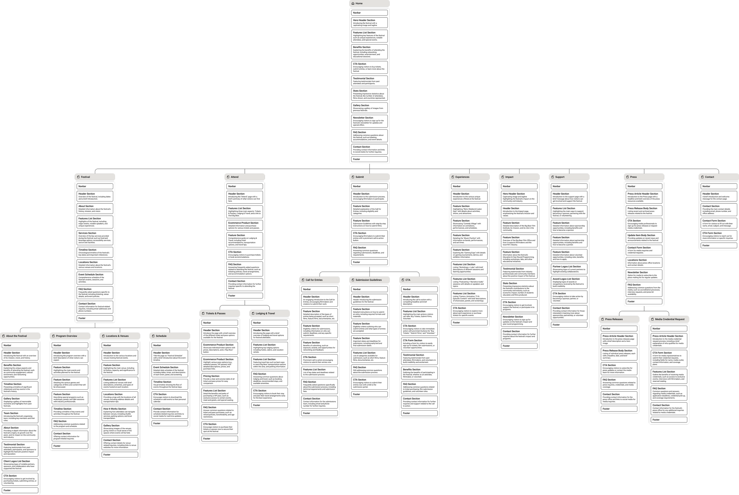 Using Figma, I developed a detailed site map that visualized every page and interaction. This allowed the team and stakeholders to see how each section connected, where information lived, and how users would flow through the experience from first click to conversion. The structure included clear global navigation, audience-specific subpages, and dedicated pathways for core actions such as purchasing tickets, submitting films, and viewing schedules.