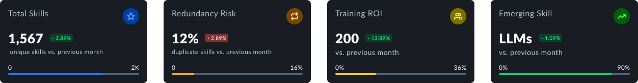 Each metric is contextualized to support workforce planning — e.g., only 7% of people had confirmed a skill, signaling potential action areas for leadership.