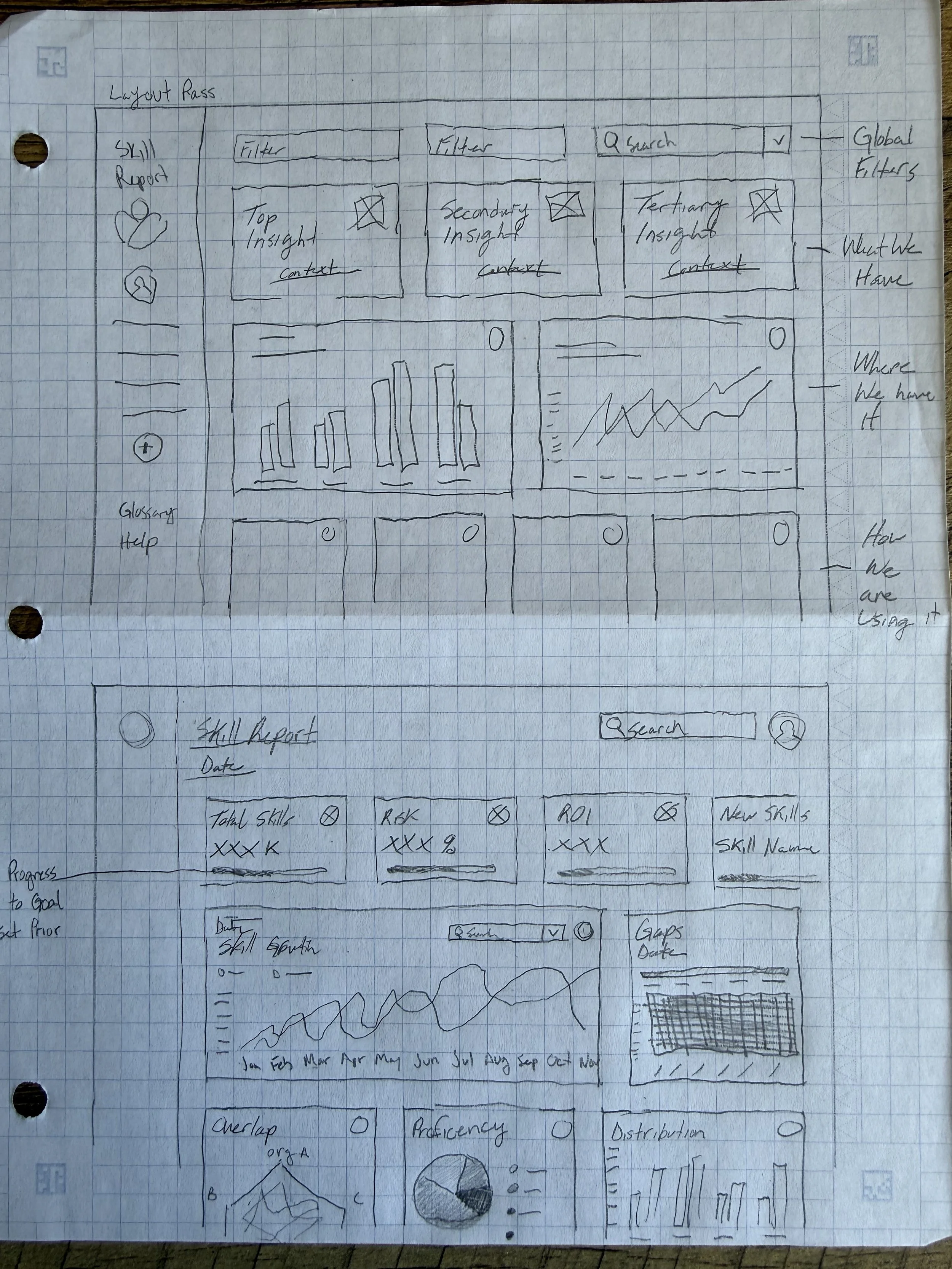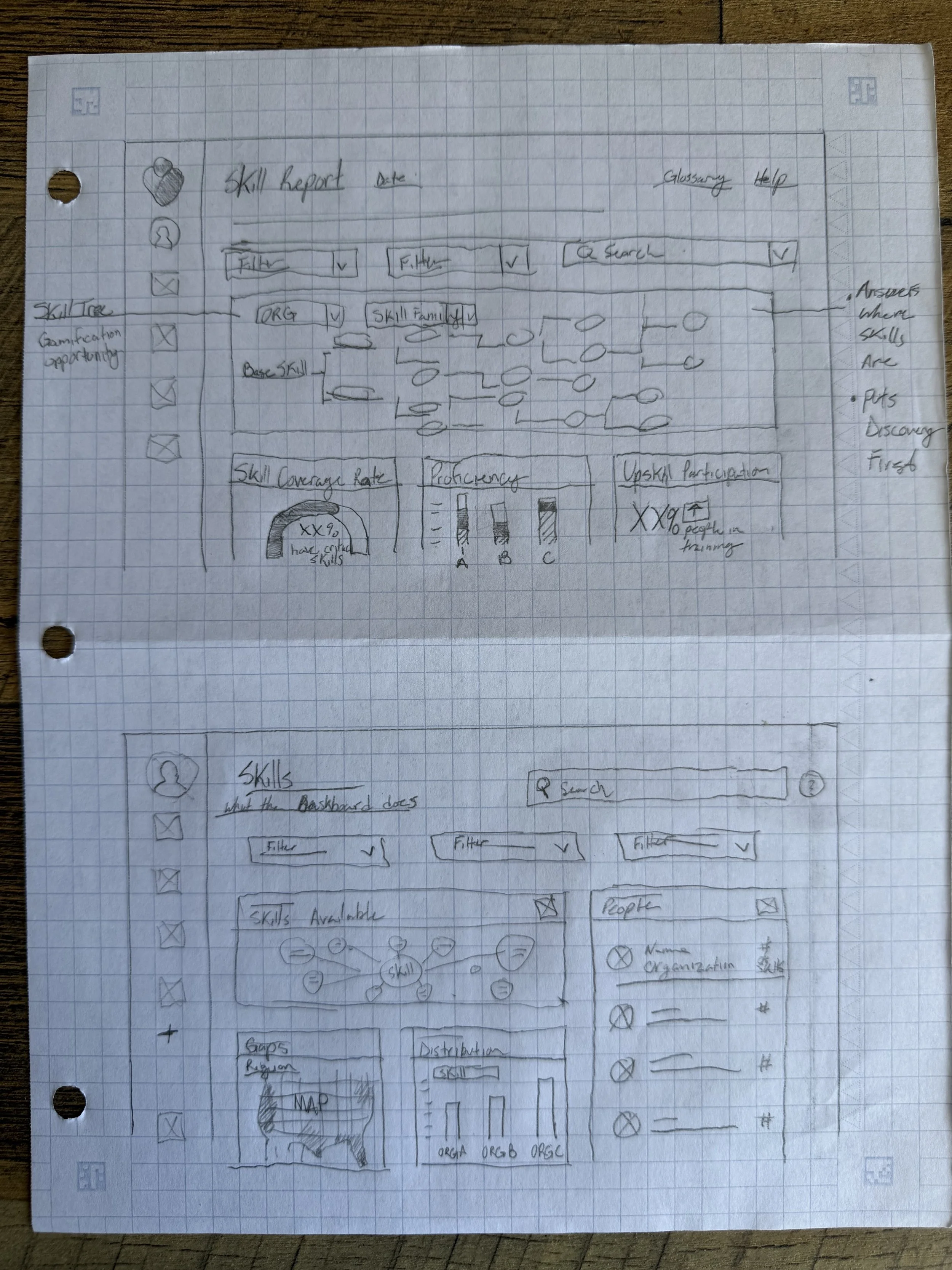At this point we felt like we had a good handle on the flow and core user needs based on our hypothesis. So I sketched out some concepts to pitch to the Senior Leadership Team during a design review.