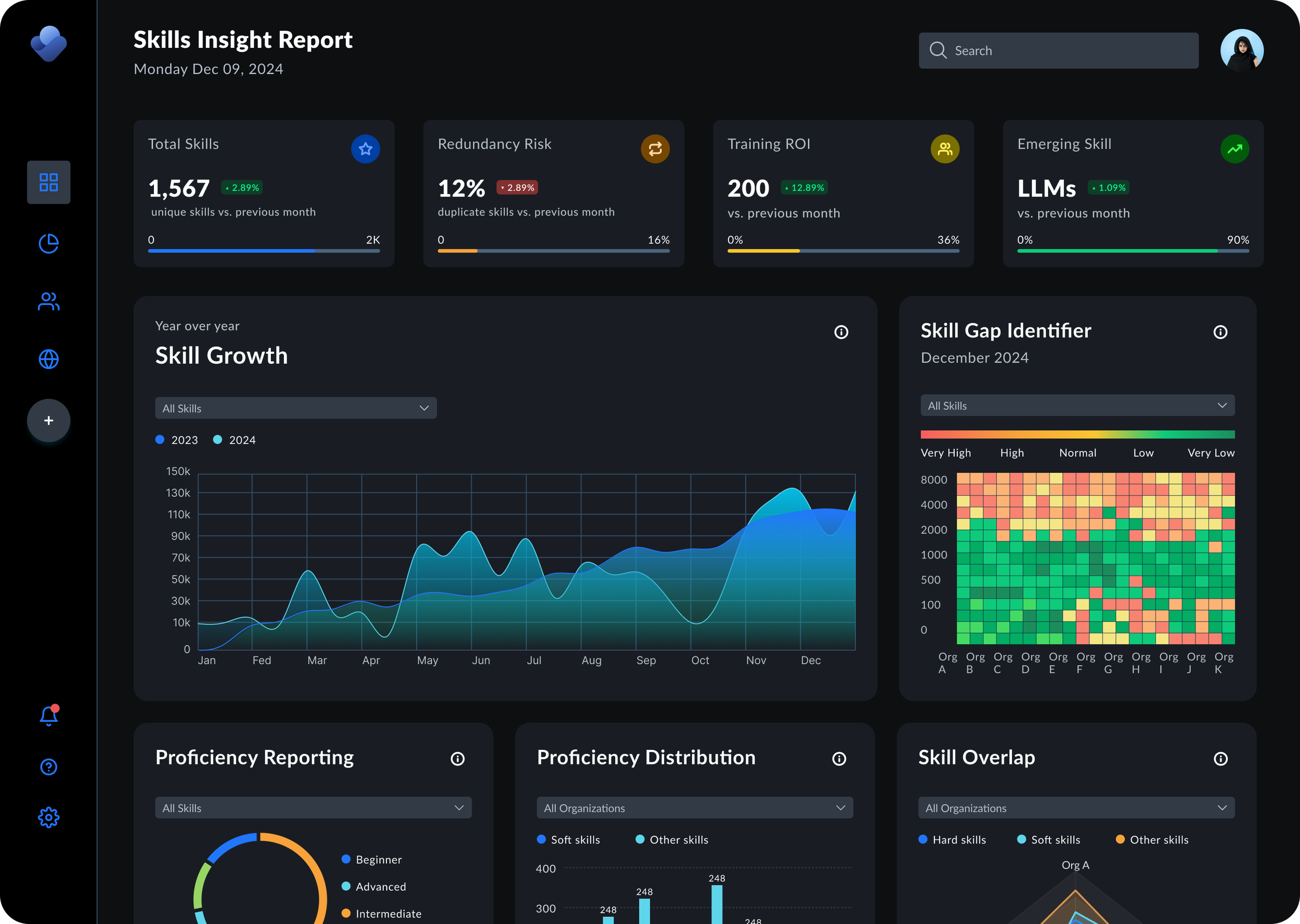 Organizations struggled to effectively analyze their workforce's skill sets at a cluster level. While they could search for specific skills in the Skills Insight Report (e.g., "NLP" or "C++"), they lacked the ability to understand broader capability areas. This creates blockers for decisions like internal mobility, reskilling, and hiring. Leaders needed a way to answer questions like "Who in my organization has data analytics skills?" without manually aggregating multiple related skills.